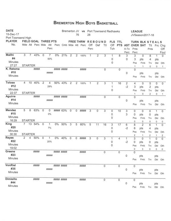 BHS Boys JV | 30 | 23 | 8 | 15 | 76 |
