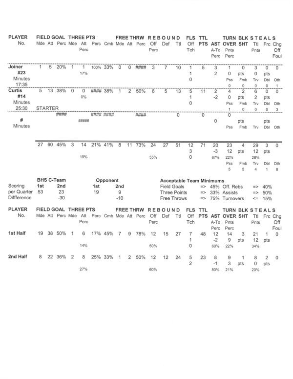 | Team Stats | 30 | 74 | 40.5 | 27 | 60 | 45.0 | 3 | 14 | 21.4 | 8 | 11 | 72.7 | 24 | 27 | 51 | 20 | 21 | 1.0 | 29 | 4 | 3 | 12 | 71 | ||