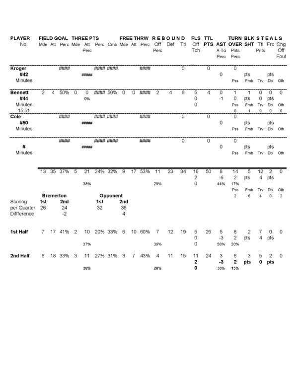 | Team Stats | 18 | 56 | 32.1 | 13 | 35 | 37.1 | 5 | 21 | 23.8 | 9 | 17 | 52.9 | 11 | 23 | 34 | 8 | 14 | .6 | 12 | 5 | 20 | 50 | ||