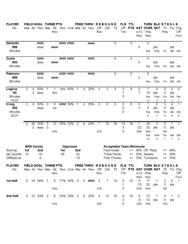 | Team Stats | 12 | 38 | 31.6 | 9 | 26 | 34.6 | 3 | 12 | 25.0 | 2 | 8 | 25.0 | 7 | 19 | 26 | 7 | 29 | .2 | 6 | 2 | 1 | 1 | 14 | 29 | |||