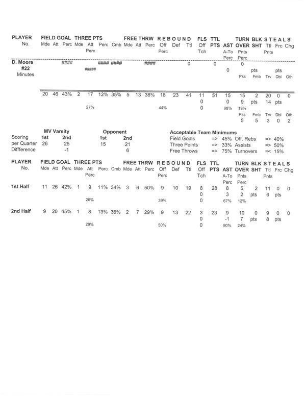 | Team Stats | 22 | 63 | 34.9 | 20 | 46 | 43.5 | 2 | 17 | 11.8 | 5 | 13 | 38.5 | 18 | 23 | 41 | 15 | 15 | 1.0 | 20 | 2 | 11 | 51 | ||