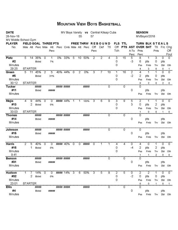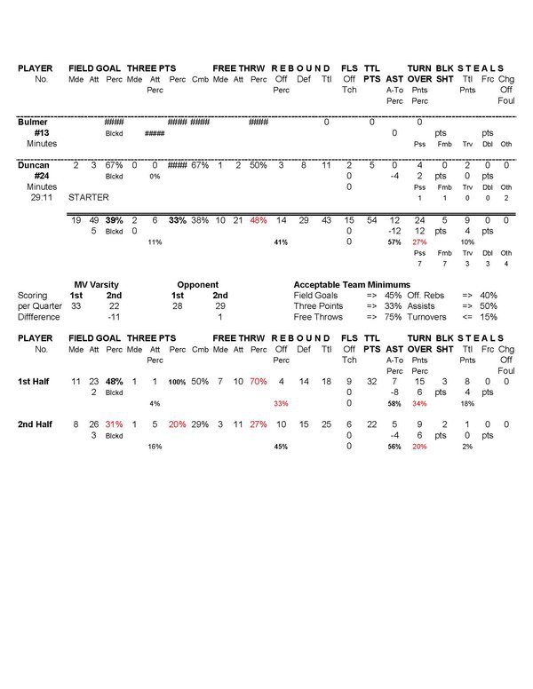 | Team Stats | 21 | 55 | 38.2 | 19 | 49 | 38.8 | 2 | 6 | 33.3 | 10 | 21 | 47.6 | 13 | 25 | 38 | 17 | 25 | .7 | 8 | 5 | 15 | 54 | ||