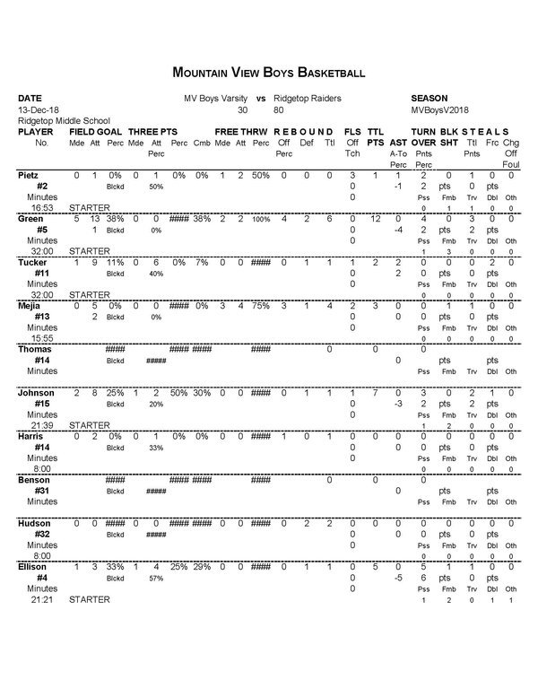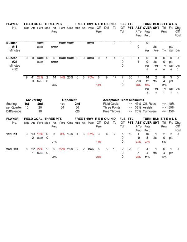 | Team Stats | 11 | 54 | 20.4 | 9 | 40 | 22.5 | 2 | 14 | 14.3 | 6 | 8 | 75.0 | 10 | 7 | 17 | 4 | 15 | .3 | 8 | 2 | 3 | 7 | 30 | ||