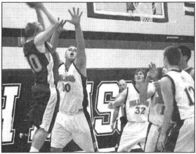 | North Mason's John Fullington (50) defends against one of Bremerton's post players in Tuesday's home game | ||