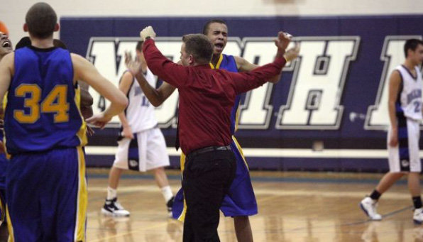 Bremerton Basketball coach Casey Lindberg, celebrates the win over North mason with player Andre Coleman. (LARRY STEAGAL \ KITSAP SUN)